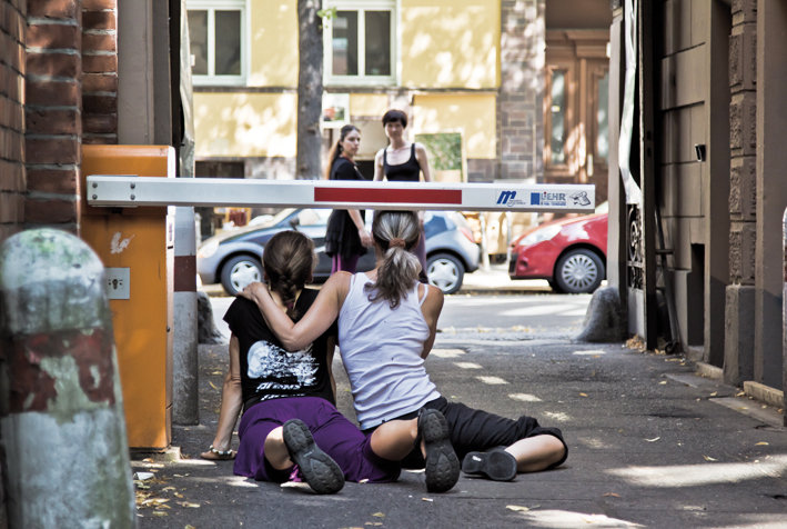 Wir verlassen den geschützten kodifizierten Raum des Tanzstudios und erkunden die städtische Umgebung. Unsere Körper werden zu „Schaltstellen“ im Raum im Kommunikationsfeld von Ursache und Wirkung. Wir trainieren unsere Wahrnehmung durch Improvisationen und üben uns darin, Räume energetisch zu lesen. Ob wir diese Feldforschungen als Performances verstehen oder nicht, entscheiden wir gemeinsam.