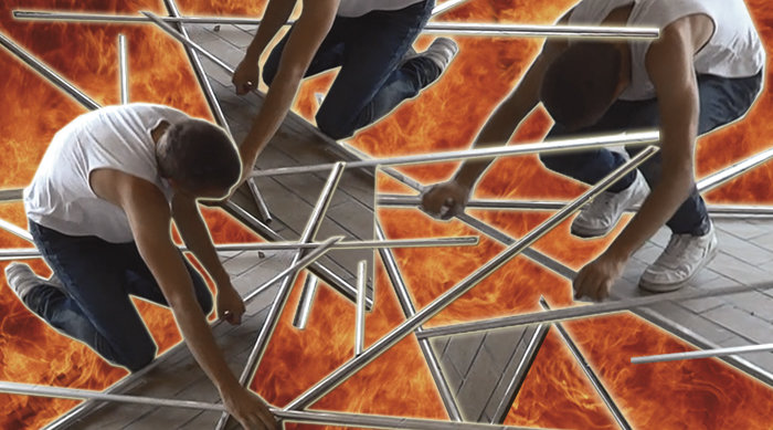 In „constructing ruins“ verschränkt Julian Weber Formate von Ausstellung und Bühnenstück. Im Dialog mit der Musikerin Tarren Johnson arbeitet er an raumgreifenden und architekturbezogenen Skulpturen, die in ihrer Skizzenhaftigkeit und Fragilität die Reibungsflächen stellen, an denen sich die flüchtige Kraft des Tanzes manifestieren kann. Praktische und suchende Körper treffen auf die Skulpturen. Das resultierende, unkontrollierbare Fallen greift aktiv in die choreografischen Setzungen ein und führt zu einer wechselseitigen Formung zwischen Material und Körper.